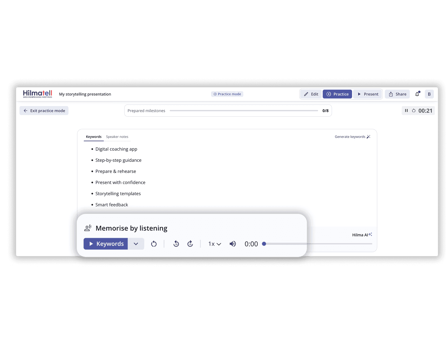 Hilmatell provides a good logical context with a speech manuscript in conversational language. In addition, you will become friends with your presentation in our practice mode. Memorize easier and become comfortable and confident so you can lift your gaze and meet the listeners. All presentations are based on relationships.